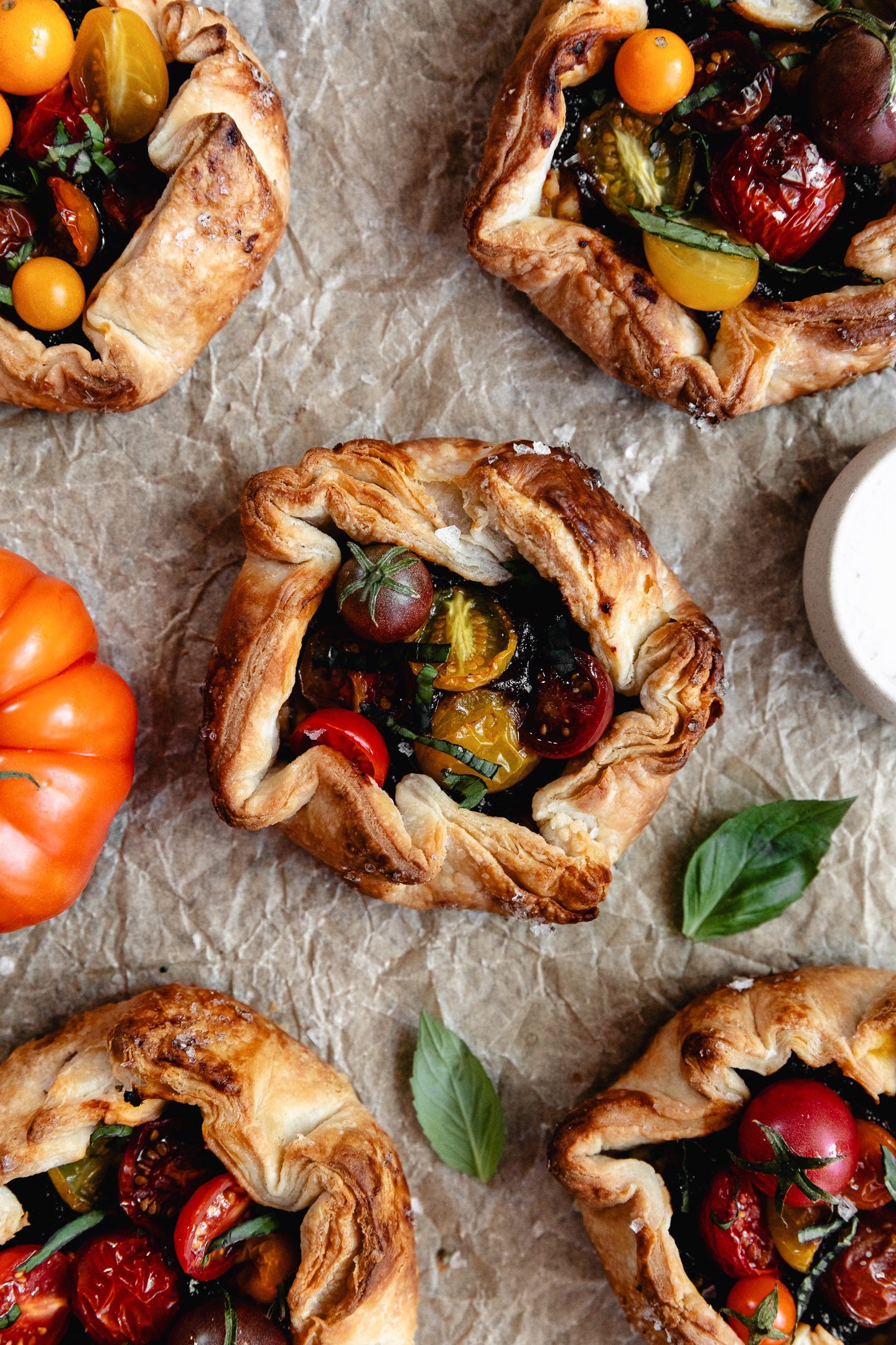 I’ll be honest, my favorite baking season isn’t fall; it isn’t the holidays; it’s right now, when all of the peak summer fruits and veggies are waiting to be turned into delicious pies, crisps, upside-down cakes, compotes, and jams. I know it’s not exactly cozy inside, in fact my kitchen right now is downright muggy, but to me it’s worth it to make the most of summer’s bounty. This post is my last of the summer, and it’s my favorite, where the star of the season - the tomato - takes center stage in some stunning galettes. To make them, I cut my vegan flaky pie dough into individual rounds, then layer these with vegan chive cream cheese and homemade balsamic tomato and onion jam.