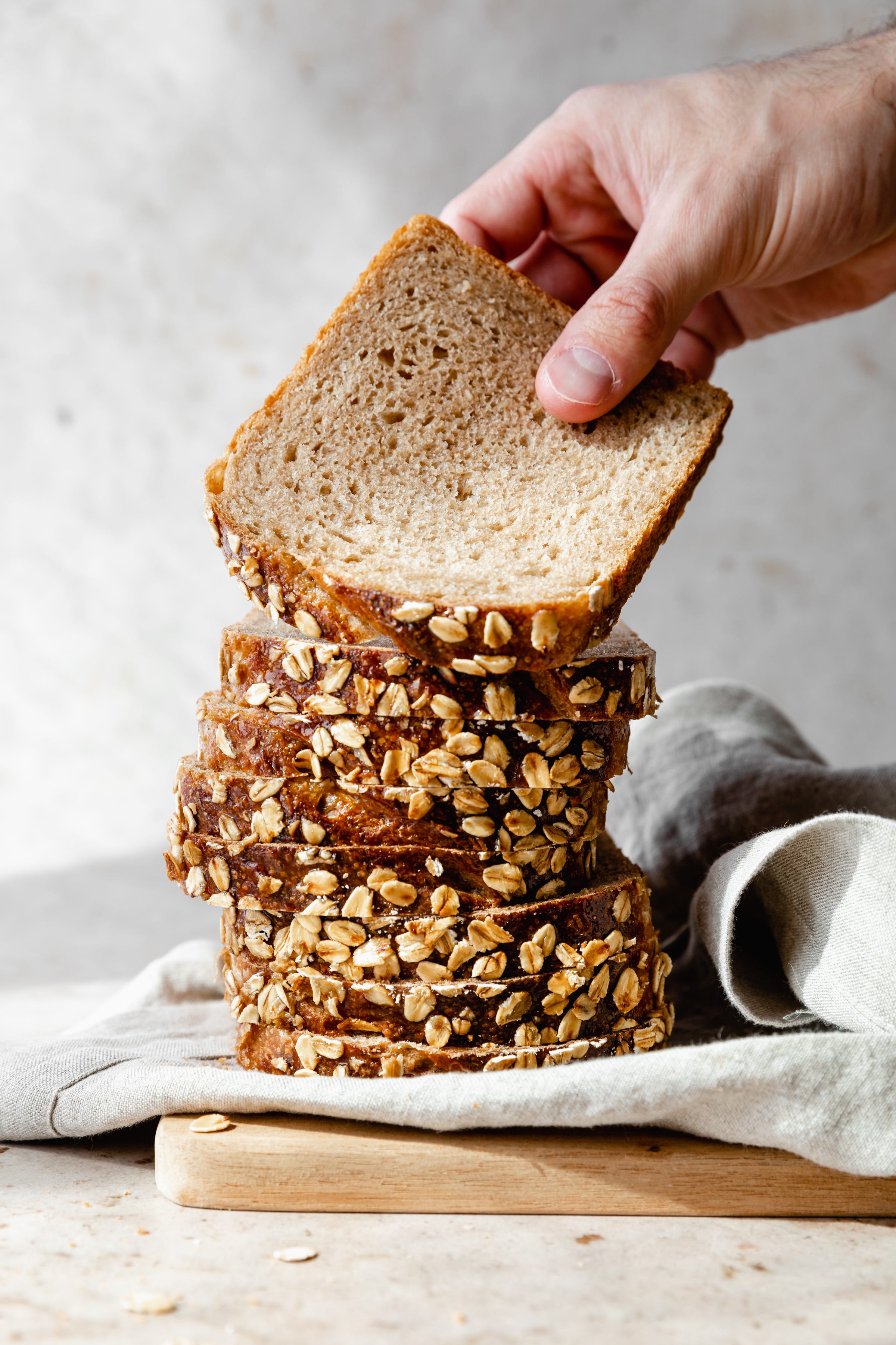 Loaf of plant-based maple oatmeal sandwich bread being sliced