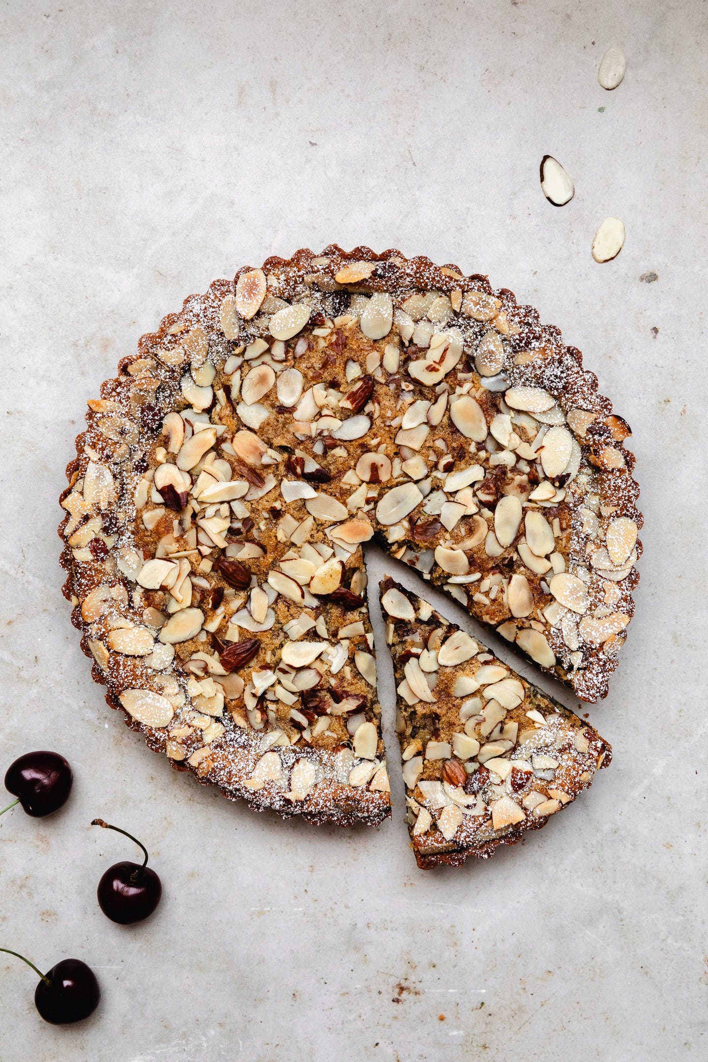 Frangipane tarts are a classic rustic pastry in the world of French baking. They can be served year-round, taking advantage of whatever fruit the season has to offer: pears in fall, apricots in summer, or even with no fruit at all in the mid-winter specialty galette des rois. But I particularly love the pairing of cherry and almond, and this recipe combines a traditional French fresh cherry frangipane tart with the British classic Bakewell tart, which uses jam instead of fresh fruit. Here, I use both, cooking down cherries into a quick jam, and also chopping them up fresh. Then the whole thing gets covered in rich, nutty vegan frangipane, showered in flaked almonds, and baked to golden perfection. I bet you can’t eat just one slice!